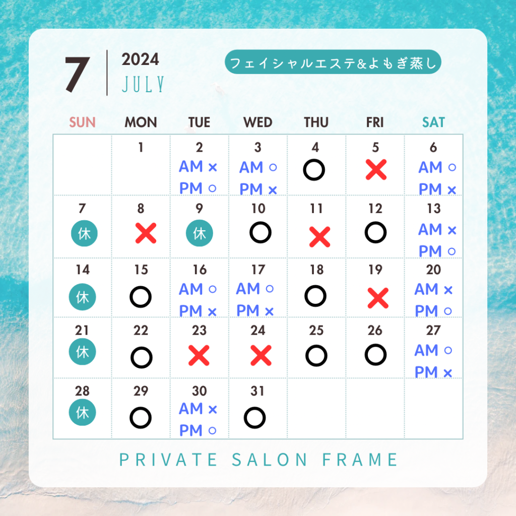 こんにちは😊ダイナム豊前店前にあるdestiny jiu-jitsu frame2F private salon frame フェイシャルエステ&よもぎ蒸し担当のmegumiです❤️明日からいよいよ🎋7月🎋ですねう‼️ 季節の変わり目は心身ともに変化が気になる時期💦フェイシャルエステ&よもぎ蒸しで自分磨きしませんか?日曜日は対応できる場合があるので、お気軽にお問い合わせください❤️