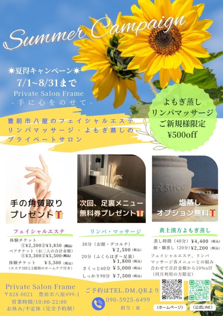 こんにちは☺️private salon frameです♡当店はオールハンドのリンパマッサージサロンとなっております😊猛暑に負けない体づくりにはぜひリンパマッサージがオススメです🫶7月からは新たなキャンペーンも始まっておりますので、どうぞこの機会に体験されてみてください😊お問い合わせお待ちしております♪